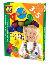 В набор входят 18 крупных разноцветных бусин (дерево) и веревочка.